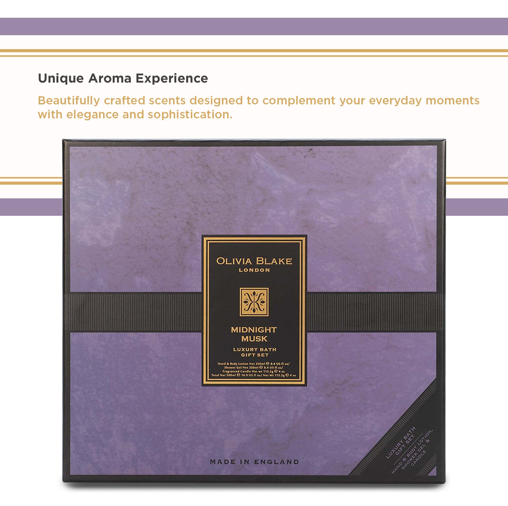 Olivia Blake Midnight Musk Trio Gift Set – Luxury Bath & Shower Gel 250ml, Hand & Body Lotion 250ml, Fragranced Candle 100ml – Elegant Home & Body Collection, Made in London