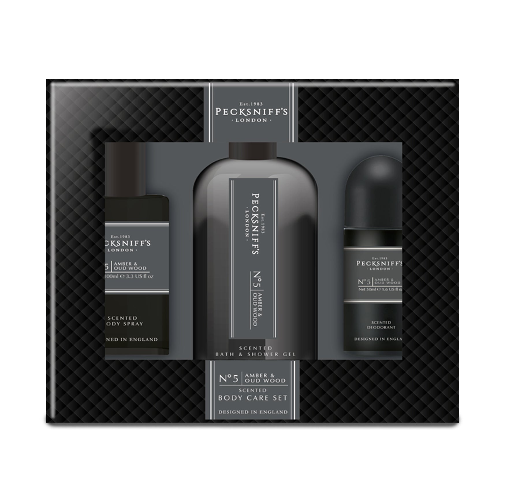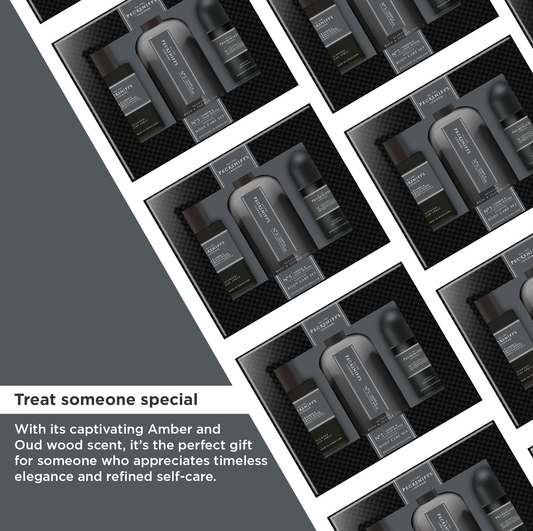 Pecksniff’s Men’s Essentials Body Trio Gift Set – Amber & Oud Wood – Bath & Shower Gel 250ml, Body Spray 100ml, Deodorant 50ml