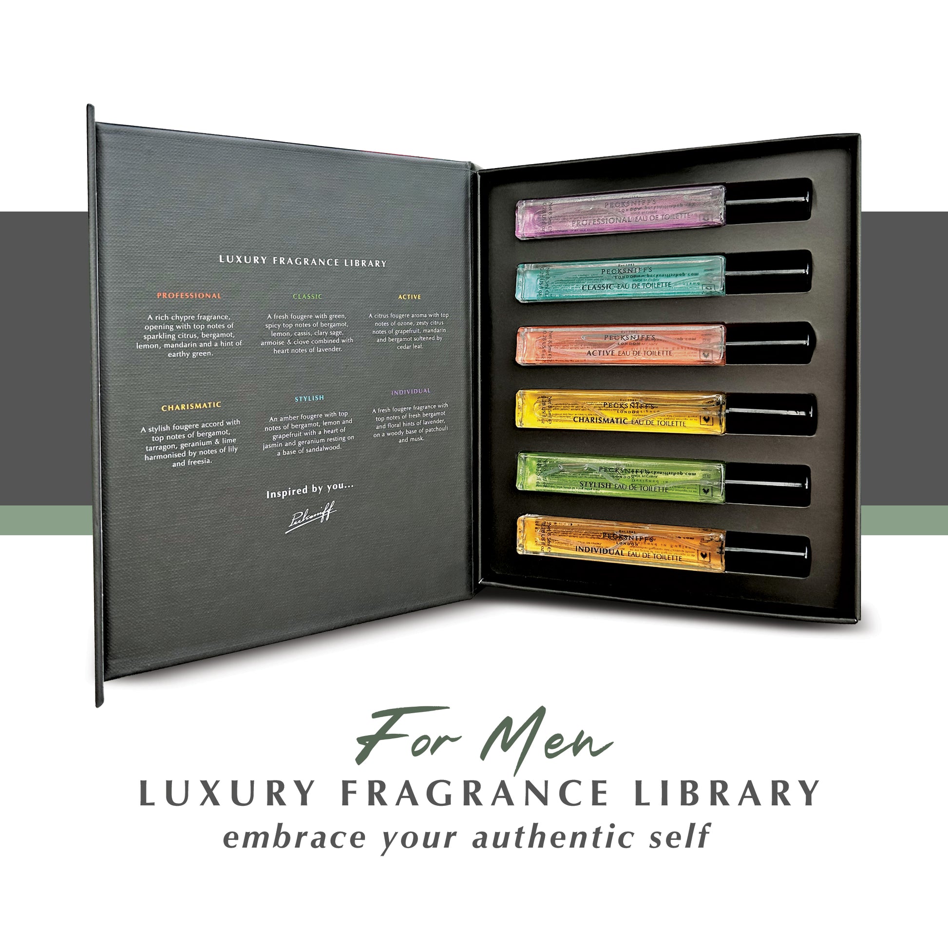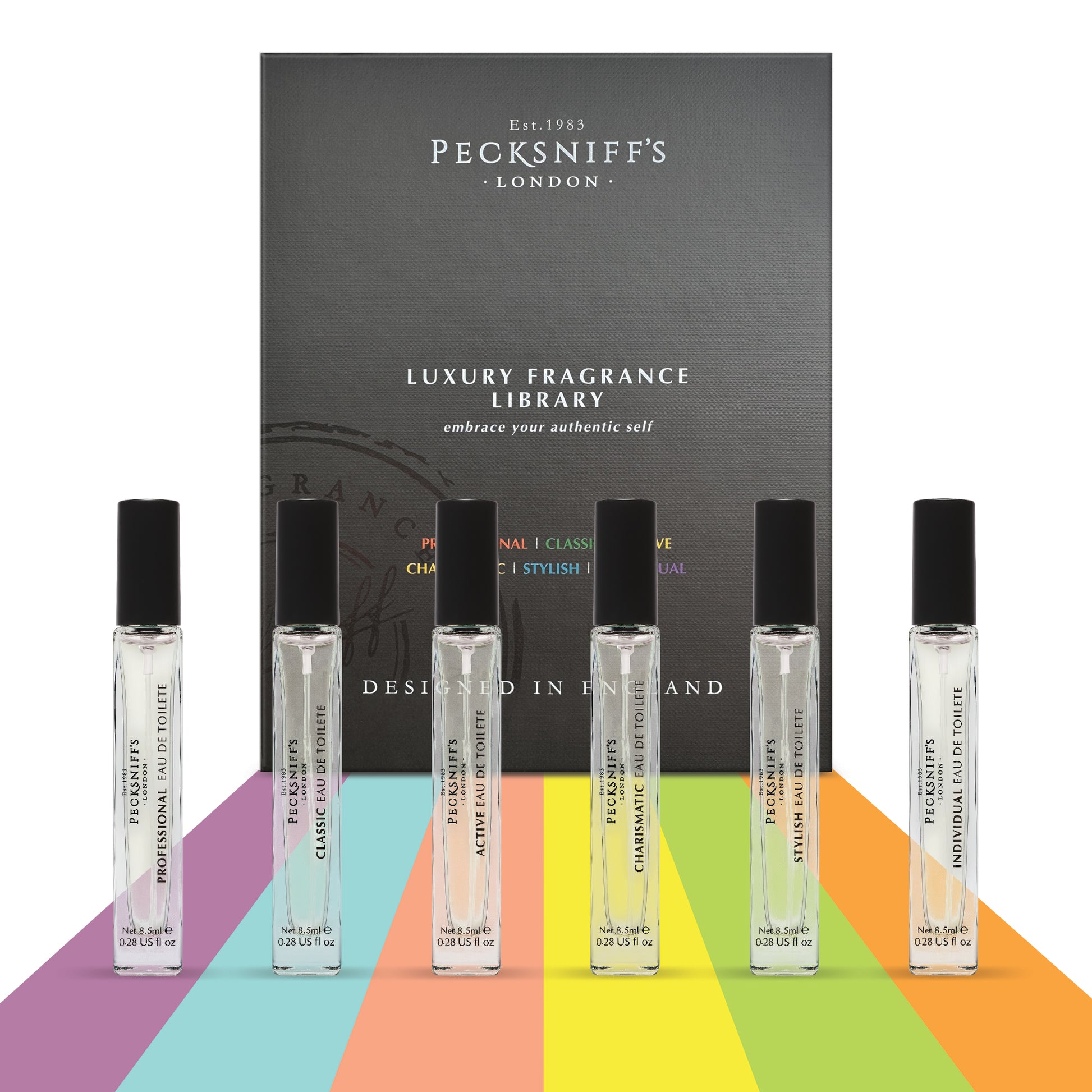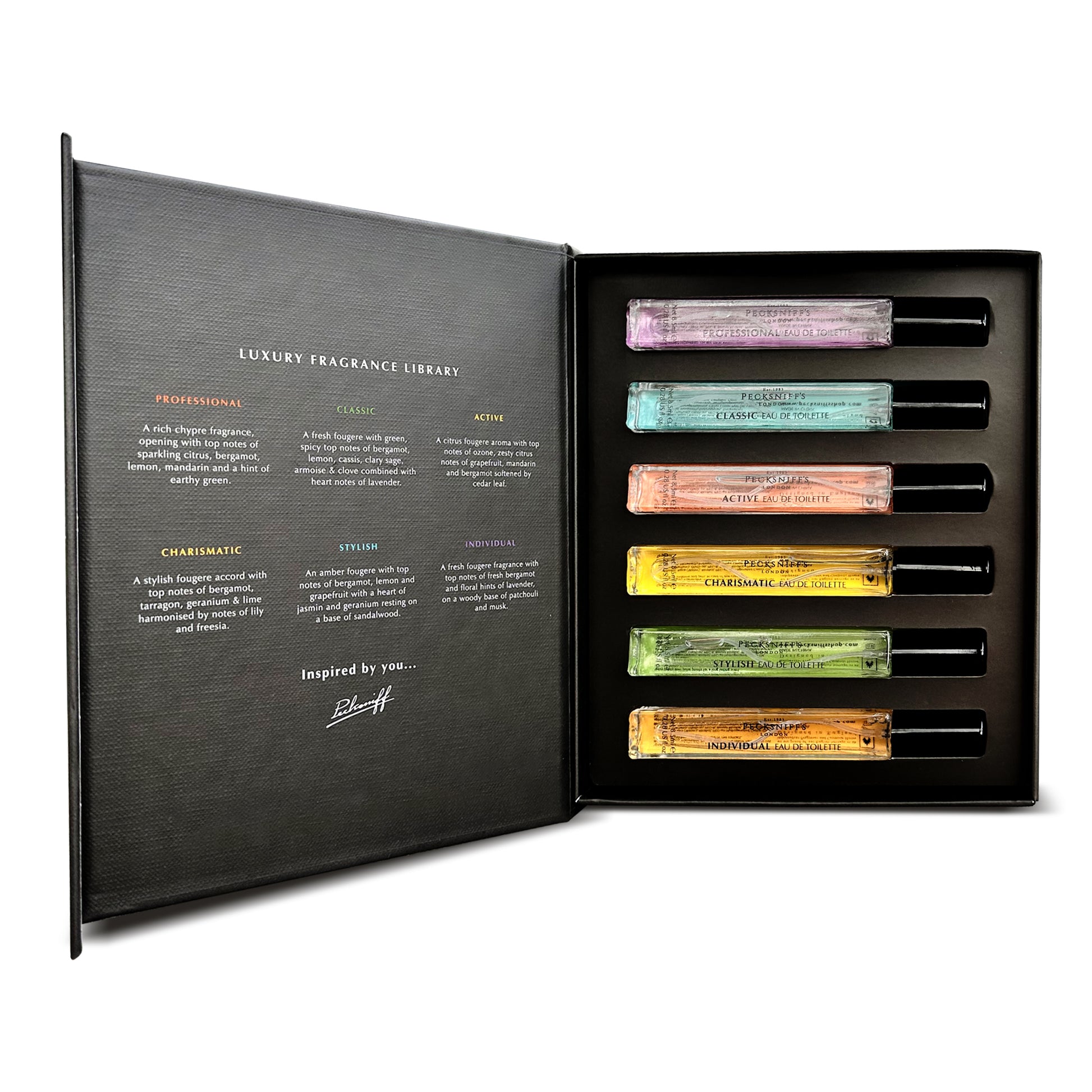 Pecksniff’s Men’s Luxury Fragrance Library Gift Set – 6x10ml Eau de Toilette Collection – Luxury Cologne Sampler, Made in England
