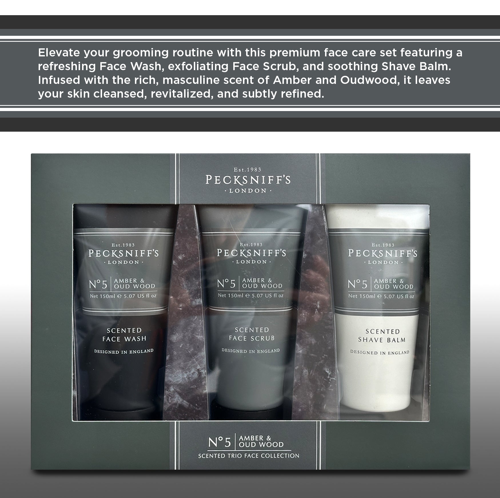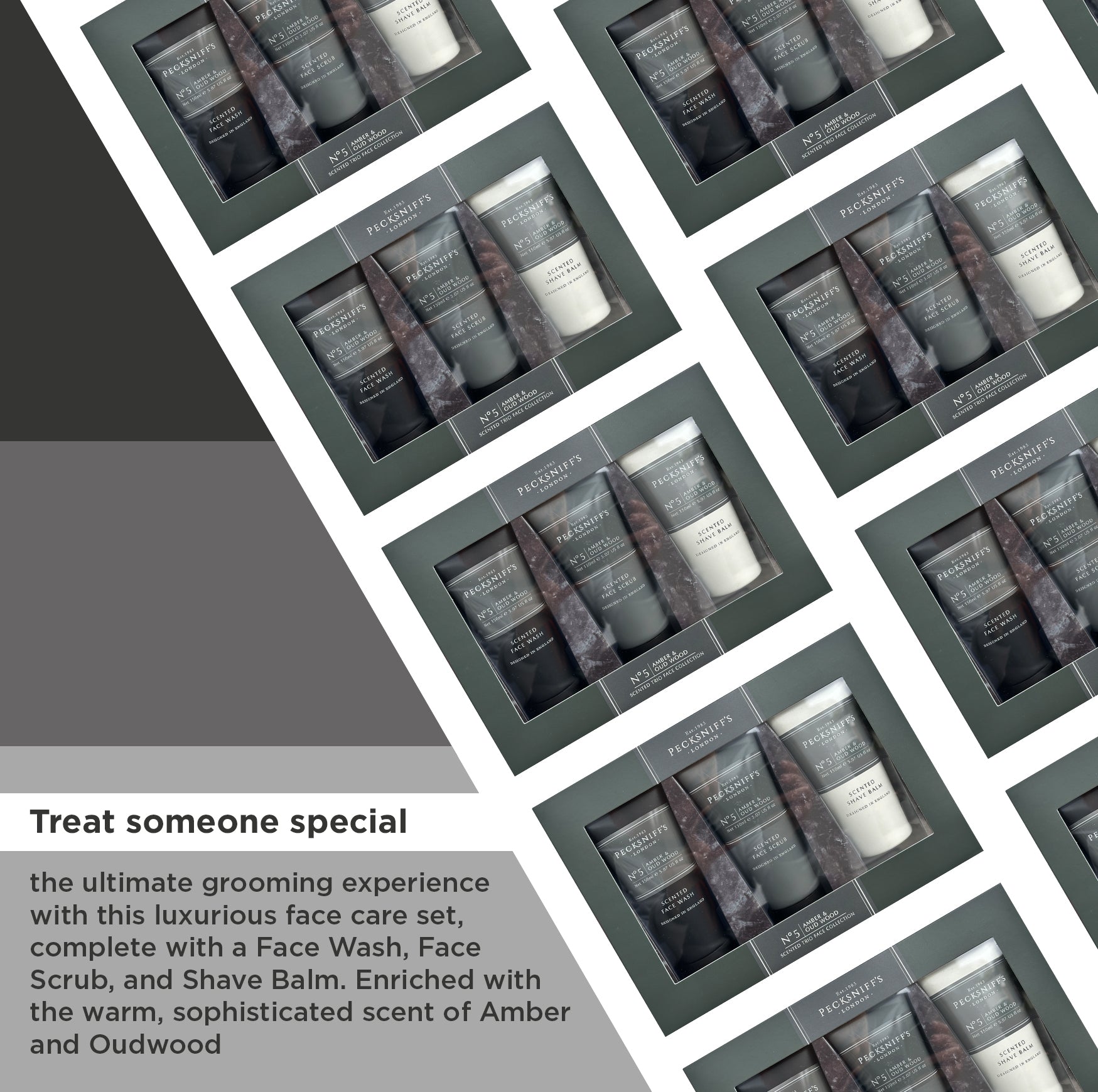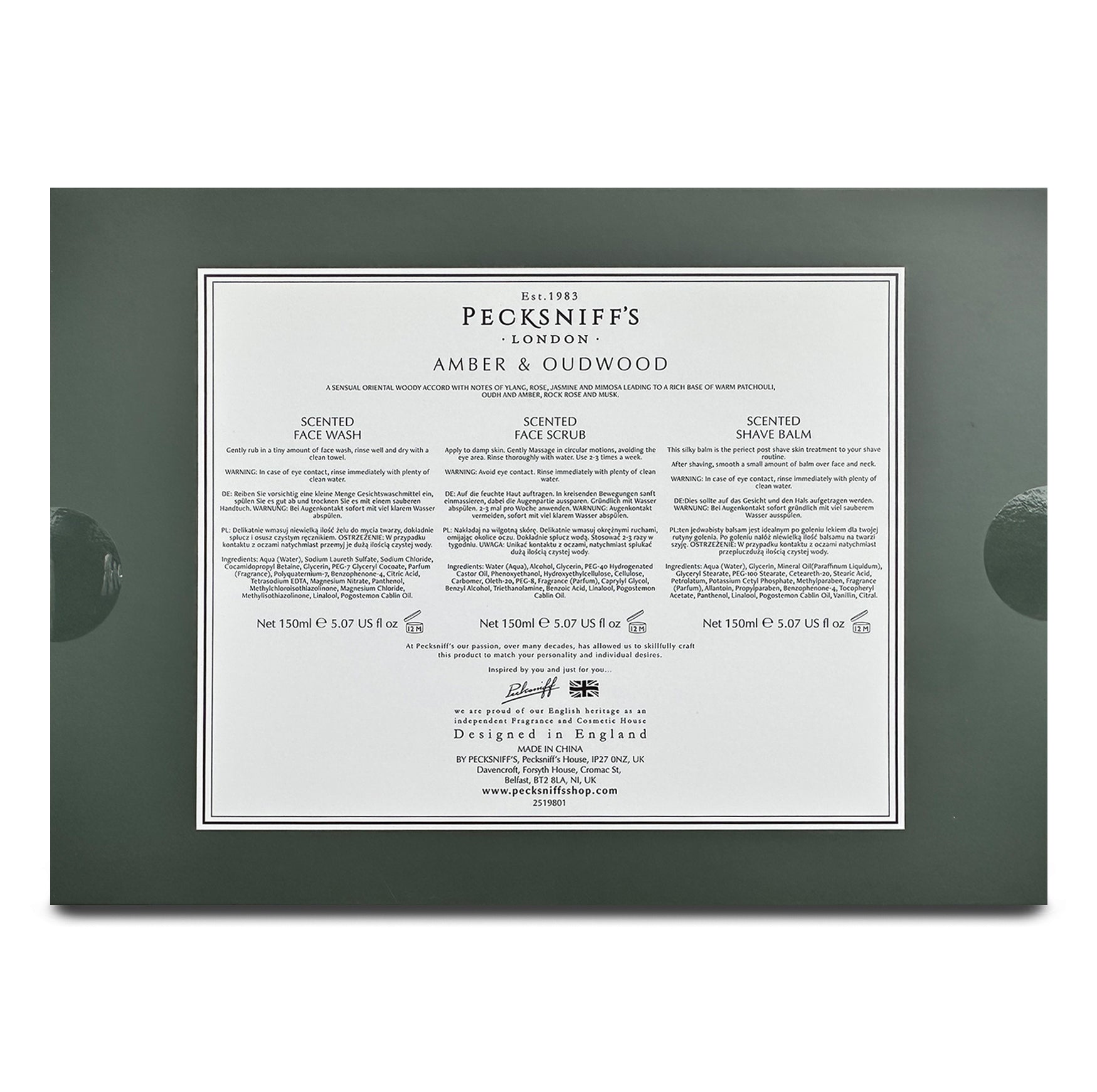 Pecksniff’s Men’s Trio Collection – Amber & Oud Wood – Face Wash, Face Scrub & Shave Balm Gift Set, 3 x 75ml