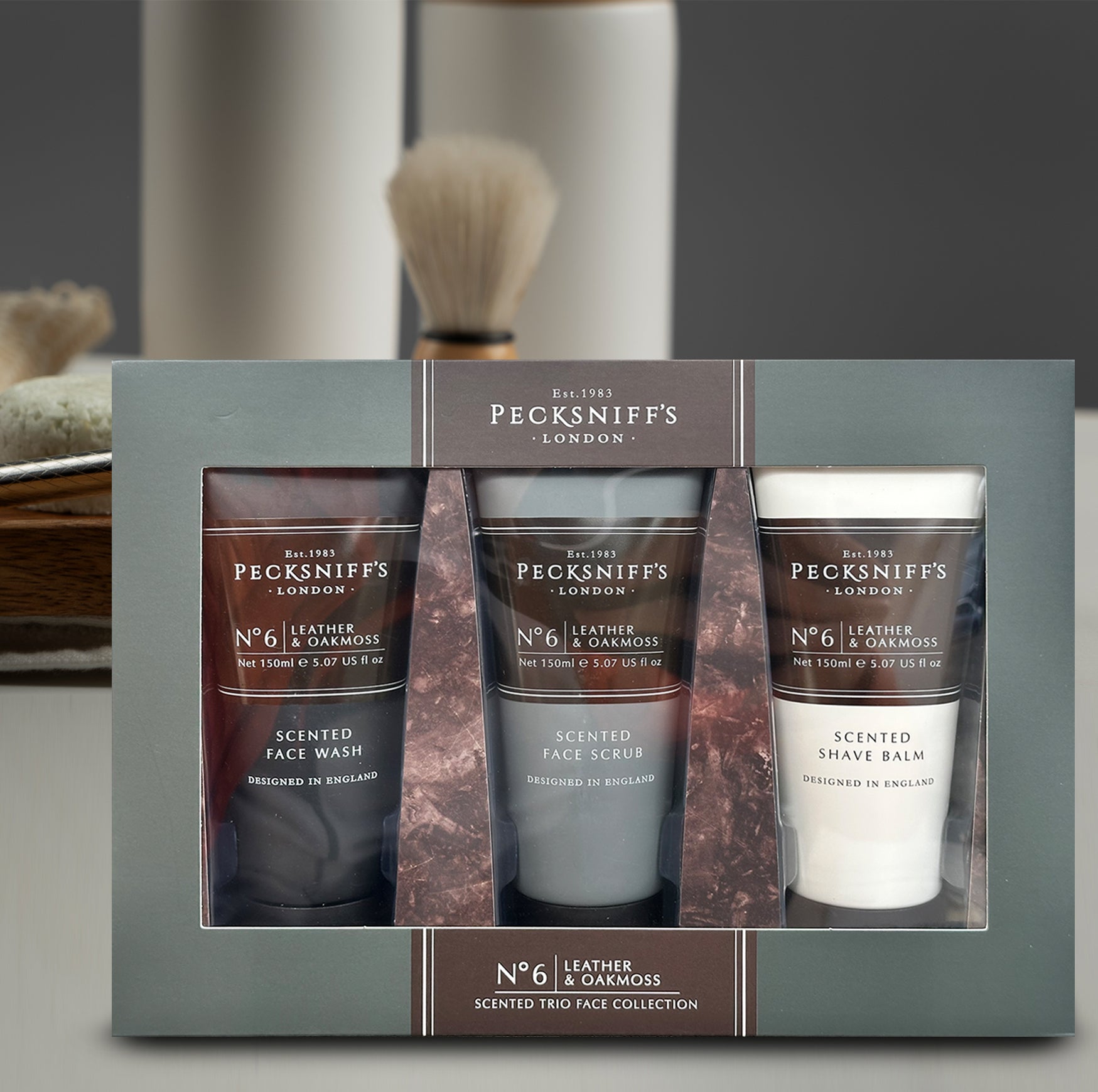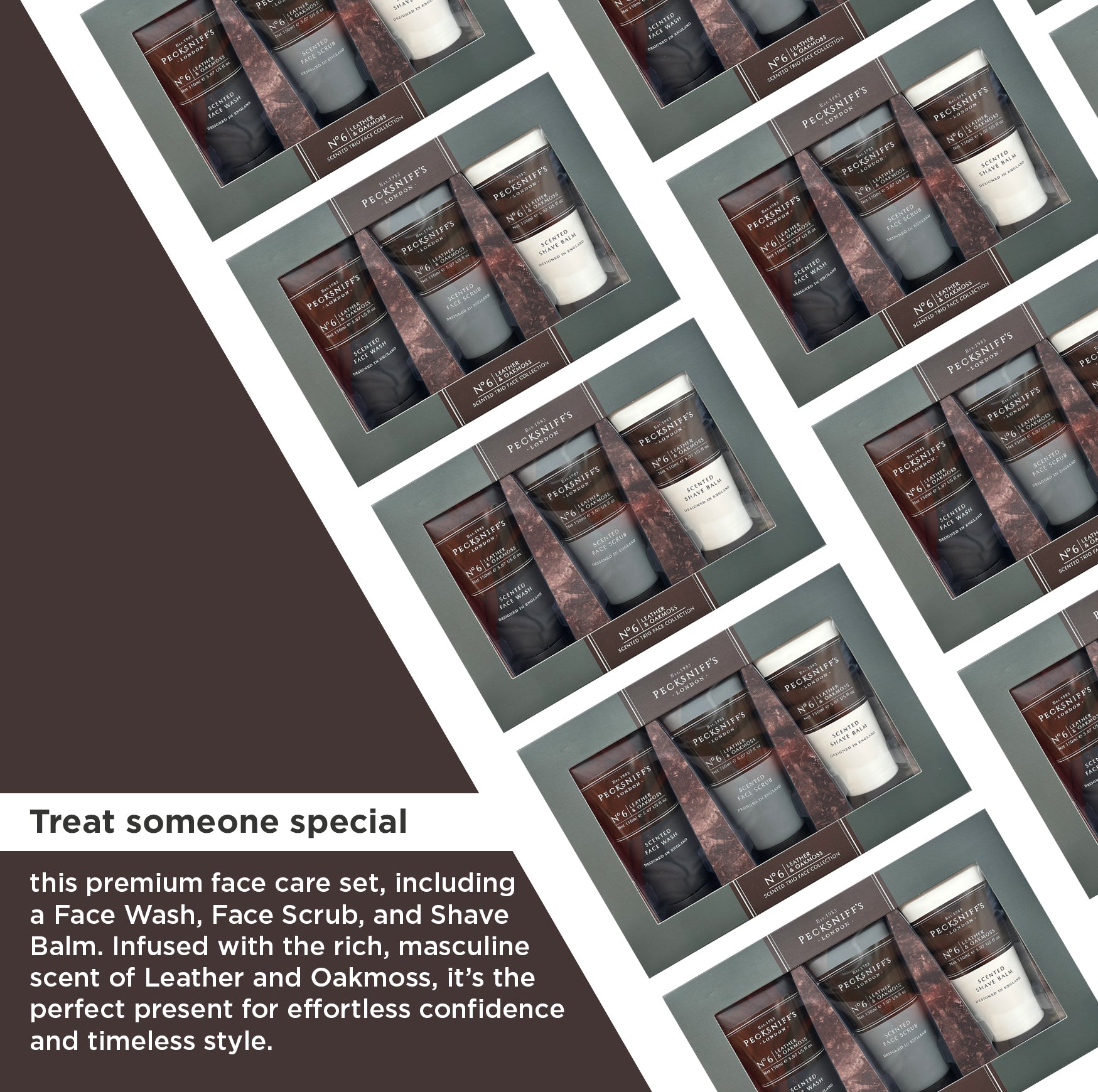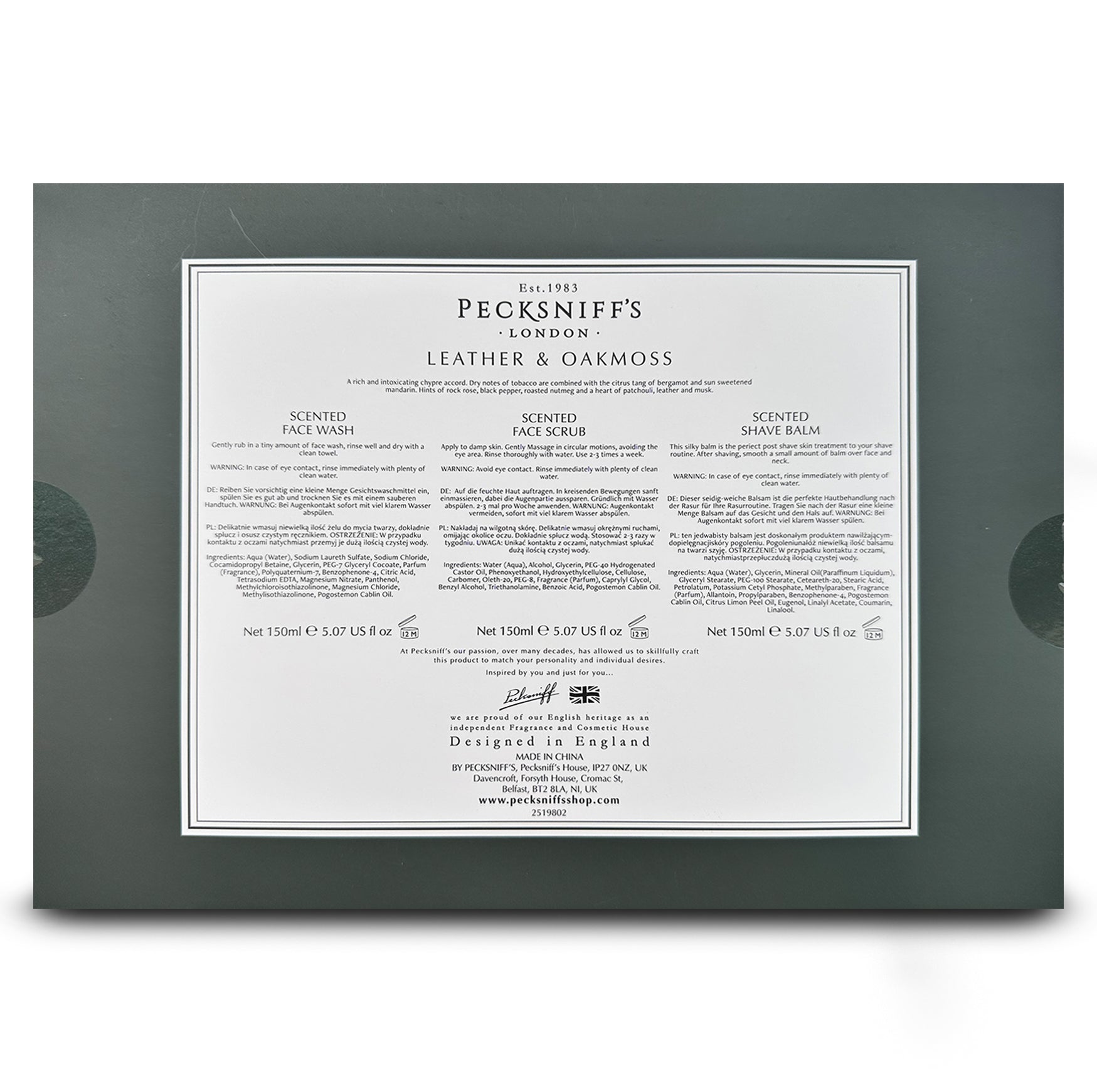 Pecksniff’s Men’s Trio Face Collection – Leather & Oakmoss – Face Wash, Face Scrub & Shave Balm Gift Set, 3 x 75ml