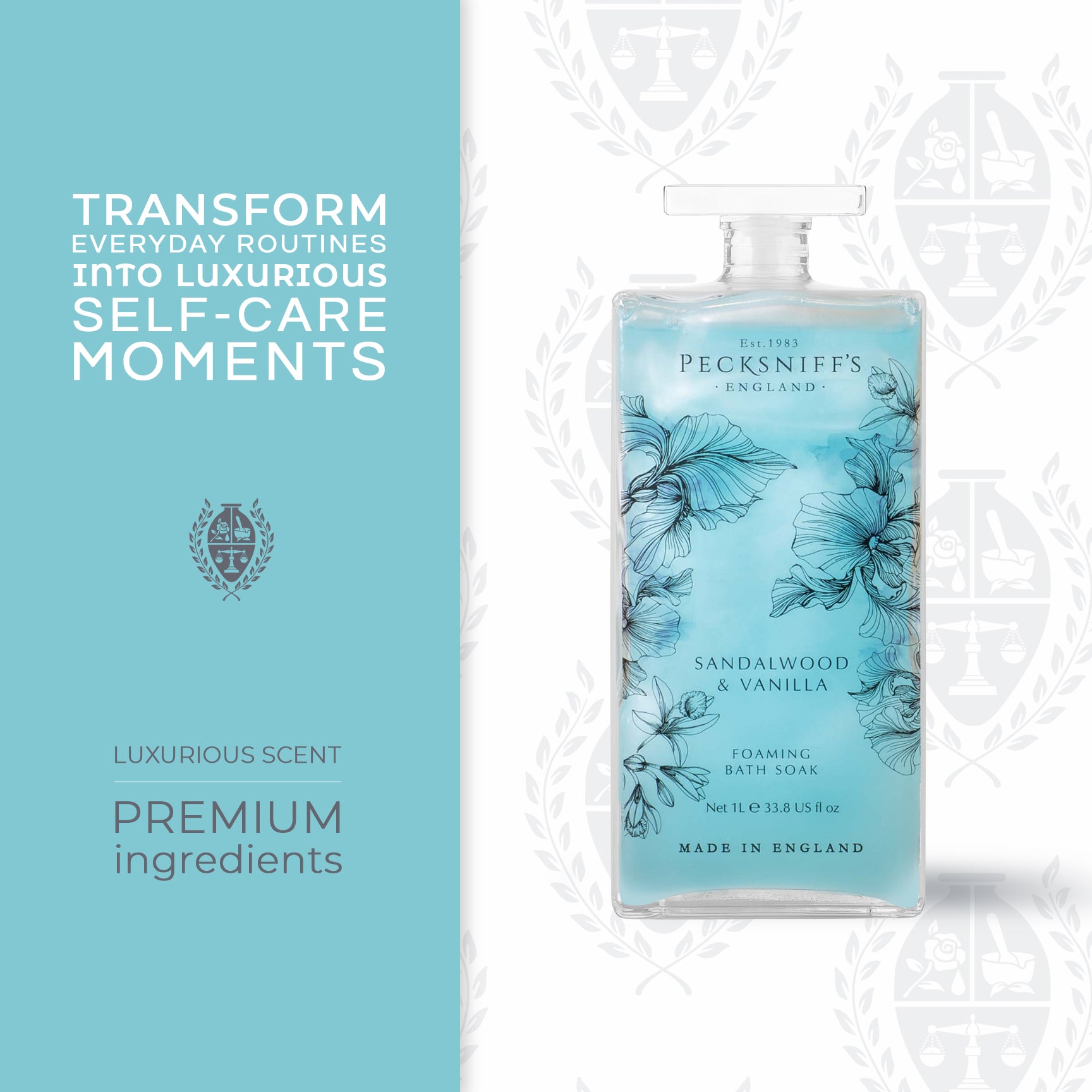 Pecksniff’s Sandalwood & Vanilla Foaming Bath Soak – Luxury Bubble Bath, 1L / 33.8 fl oz, Made in England