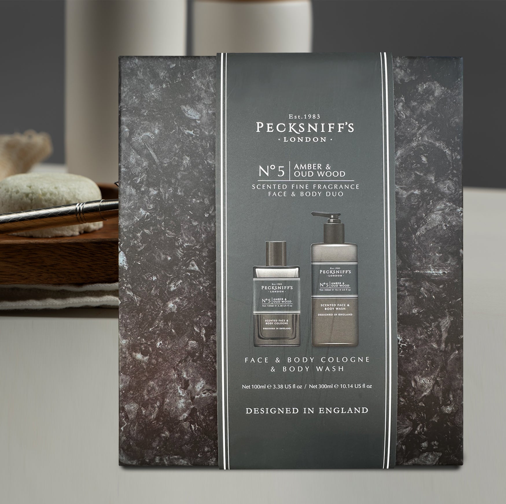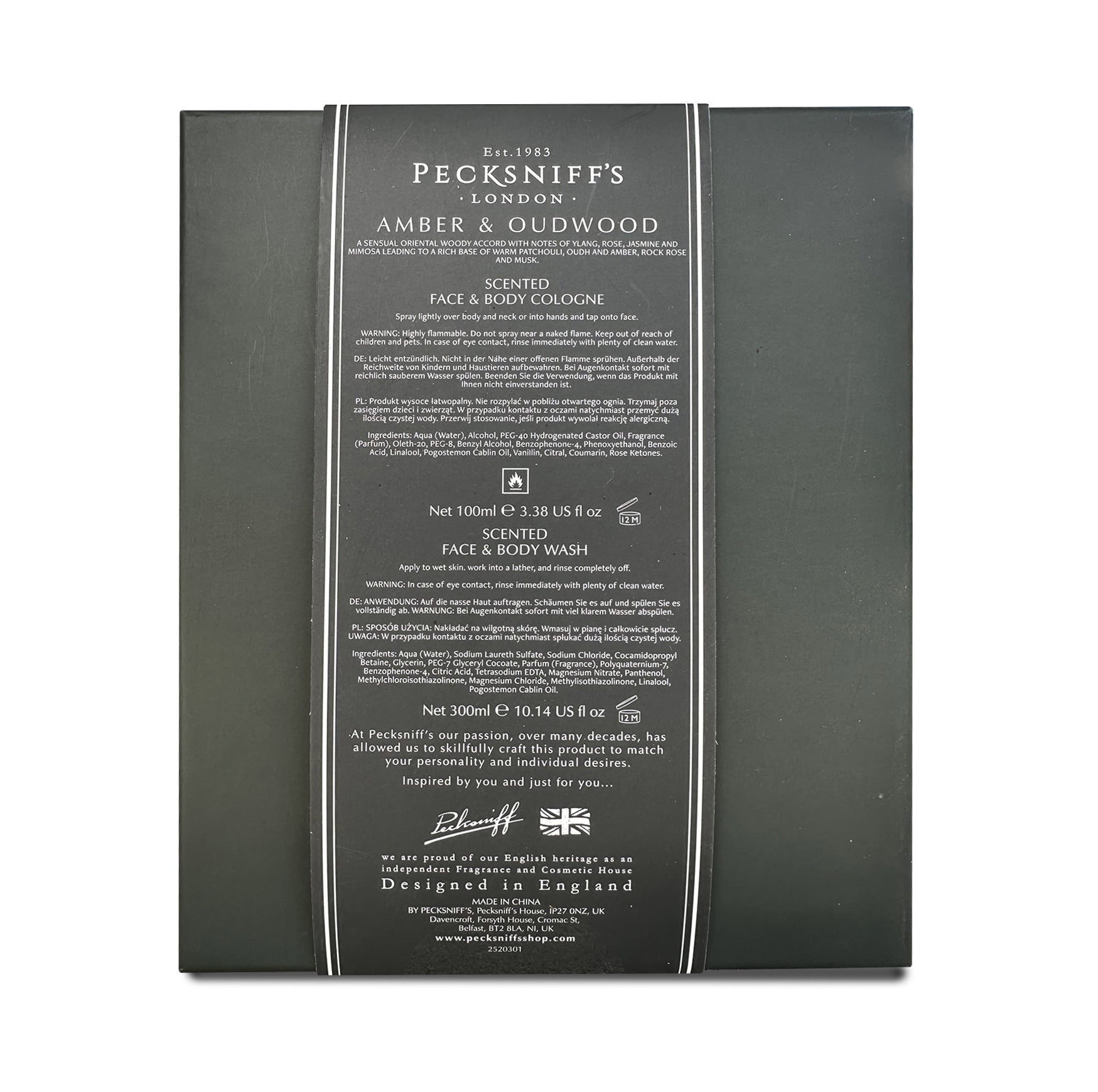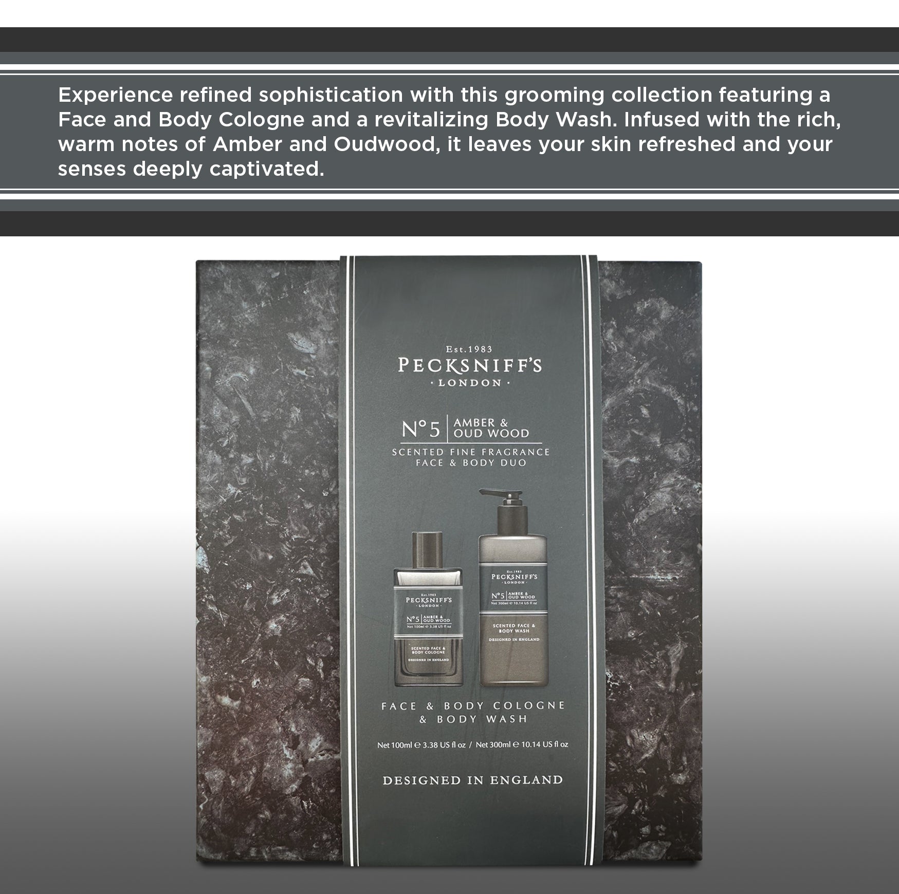 Pecksniff's Face & Body Duo Amber & Oud Wood – Men’s Grooming Gift Set with 100ml Face & Body Cologne and 250ml Body Wash – Luxury Fragrance Collection, Made in England