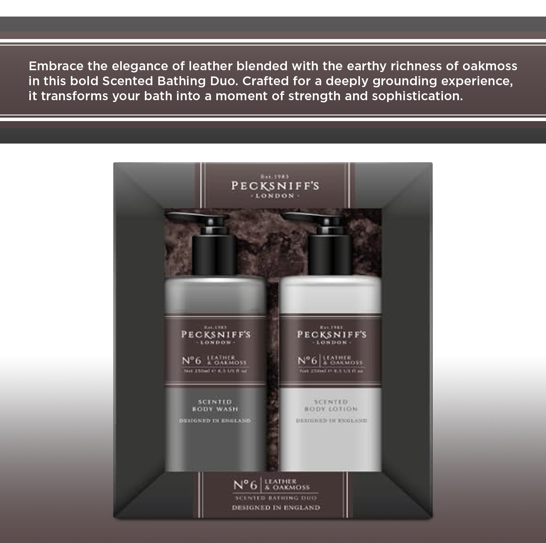 Elevate your daily routine with the refined sophistication of Pecksniffs Mens Bathing Duo Collection in Leather & Oakmoss. Designed in England, this premium gift set includes a 250ml scented body wash and 250ml scented body lotion, carefully paired to deliver an indulgent cleansing and moisturizing experience.